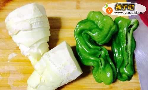 2接下来将春笋剥皮,青椒去蒂,腊肉洗干净,分别切成片放在盘子里备用。