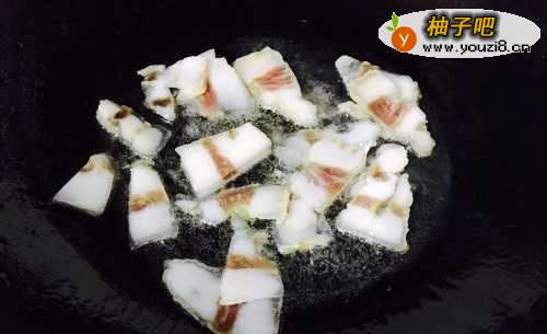 4紧接着开火,锅烧热之后加入适量油,油稍微比日常烧菜多一点,因为春笋要油多才好吃。油热之后把腊肉倒进去煸炒,煸炒至腊肉呈透明状即可把沥干水分的春笋和木耳导进去翻炒。