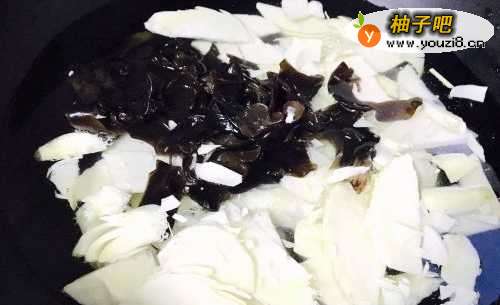 3将春笋和木耳与冷水一起下锅,开大火焯水,此步骤是为了去除春笋的涩味,同时缩短木耳和春笋的烹制时间。烧开之后过冷水沥干水分即可。