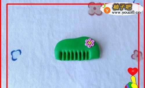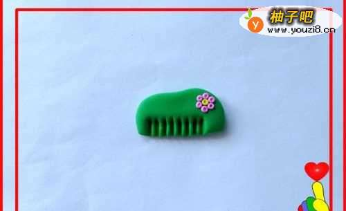 6最后取粉紫色和黄色彩泥适量,滚搓成小圆点,粘合在“梳子”的右上角,成小花的造型,进行点缀。