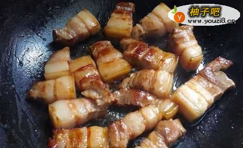 5开大火继续翻炒,翻炒至五花肉全部上色,继续中火翻炒一会,把五花肉的油脂煸炒出来,然后加入适量的冷水,开大火煮开。