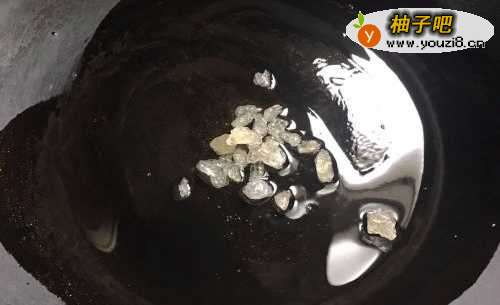 4接下来开始炒糖色,先开火锅烧热之后倒入少许油,油热之后把冰糖放进去,炒到冰糖颜色呈现褐色即可把五花肉倒进去翻炒。