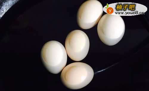 2接下来另起一锅,把鸡蛋与冷水一起下锅煮熟,大约5分钟即可,然后把鸡蛋浸泡在冷水中,剥掉蛋壳,把鸡蛋放在碗里备用。