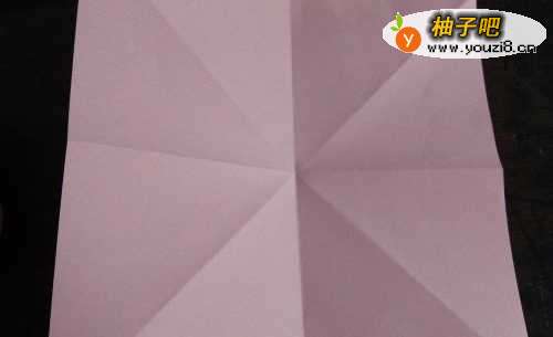 先把彩纸的中间折出个米字型,然后根据折痕折成图二的样子、把两侧的角向内折,开启后再把角平分,如图四。