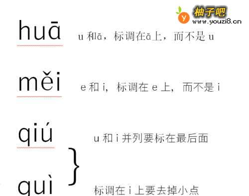 如果同时有两个韵母,先标a,o,e,再标iuv,iv并列标在后。(即有a先标a,没有就标o,都没有就找e,以此类推,按aoeiuv的顺序优先标注顺序靠前的韵母,没有就找下一个);