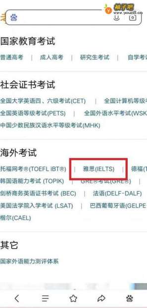 2网页点击选择海外考试大量,雅思考试项目。