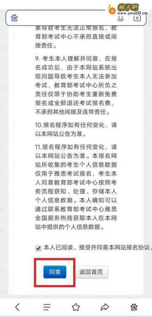 5同意雅思考试报名须知和条款,输入信息提交报名申请。