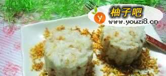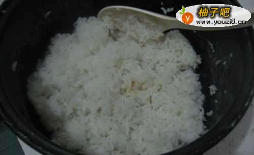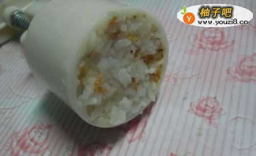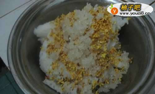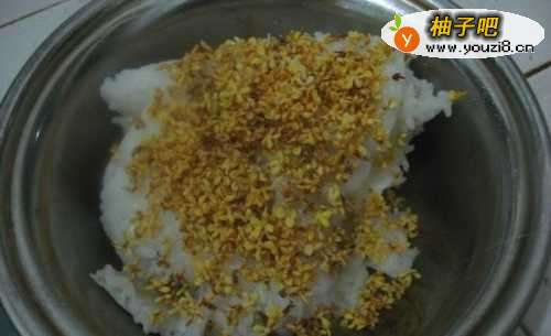 3压好的米饭成了年糕样的东西了,倒出来,加入桂花。