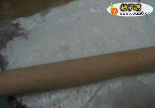 2冷却后的米饭放入保鲜膜袋子中,用擀面杖压。