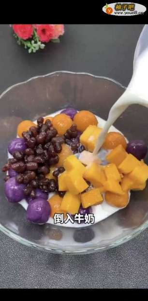 6倒入容器中,加蜜豆、芒果,牛奶