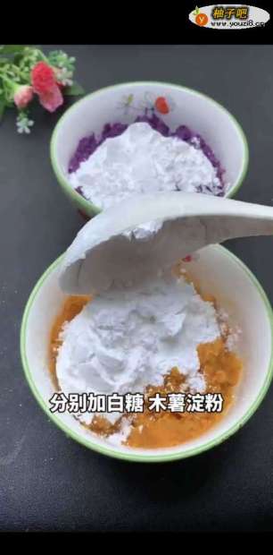 2分别加白糖、木薯淀粉,揉成圆团