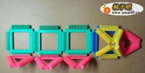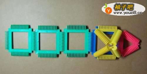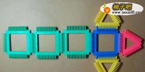 4然后拼装慢慢爬的毛毛虫头的部分。由三个三角形积木所组成。摆放的位置,如下图所示。