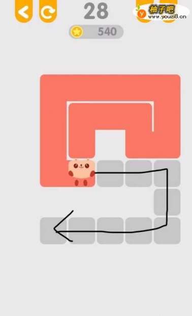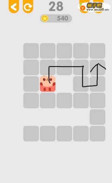 4第28关,这一关能把它看成一个数字五,然后在上面的括号里面有一些方块,第一步,先把方框里面的六个方块走完,如图所示,