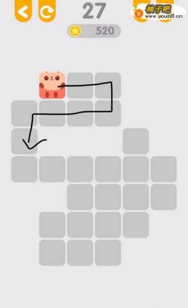 第27关,这一关我们先走上面的部分,第一步,走一个顺时针,把上面的七个方块走完,