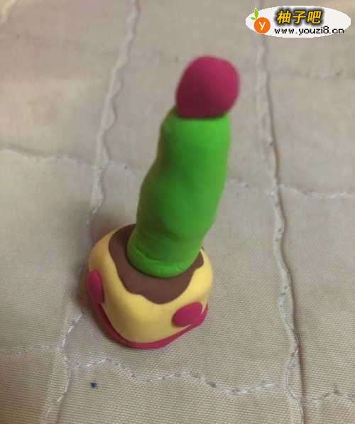 5在拿出红色的彩泥揉成圆形粘到上面。
