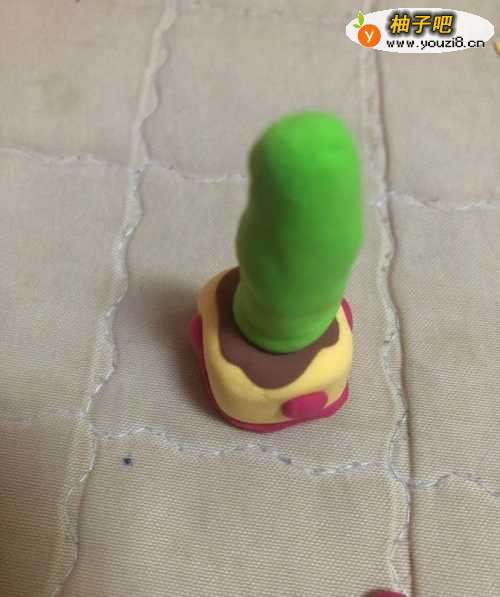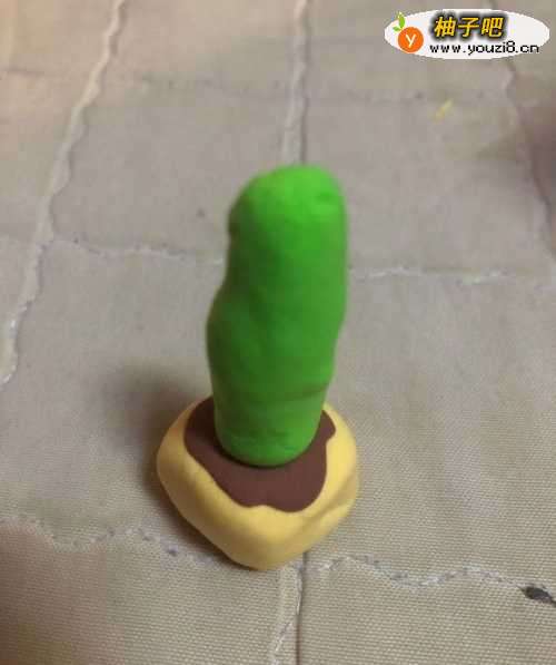 2在拿出绿色的彩泥揉成一个长条,放在花盆上面。