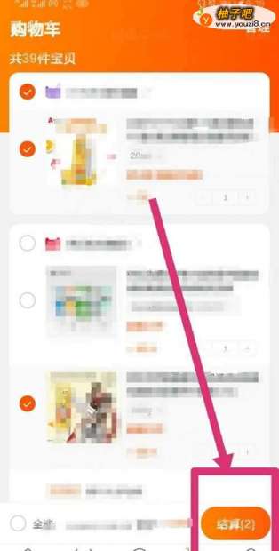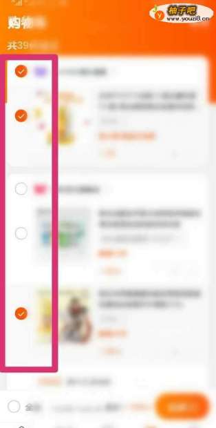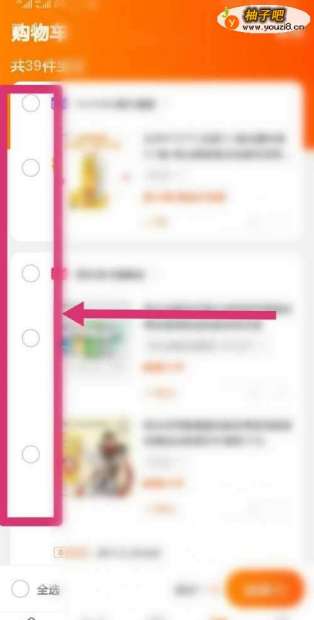 3这里能看到购物车里有39件商品,但我只想买两件。那怎样做呢?我们能看到这些商品面前都有一个空心的小圆圈,