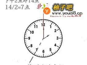 例如下午2点为14时, 14/2=7 将7点位置对准太阳>12点位置所指的方向便是北方