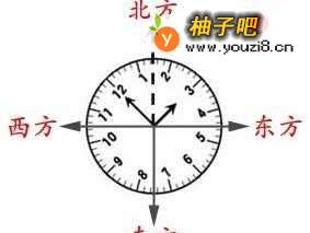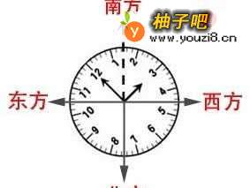 将时针指向太阳所在方向,在它与12点夹角的二分之一处设想一条线,它所指的方向便是南方。