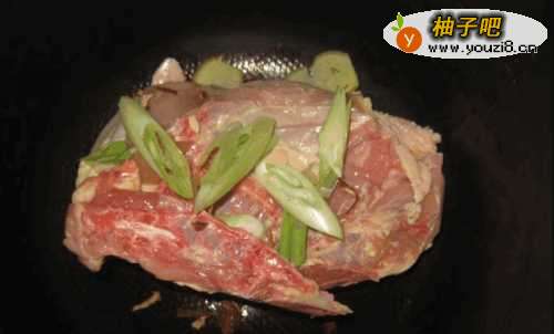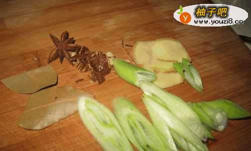 2准备姜片,香叶,八角,葱段;陈皮提前泡软切丝。