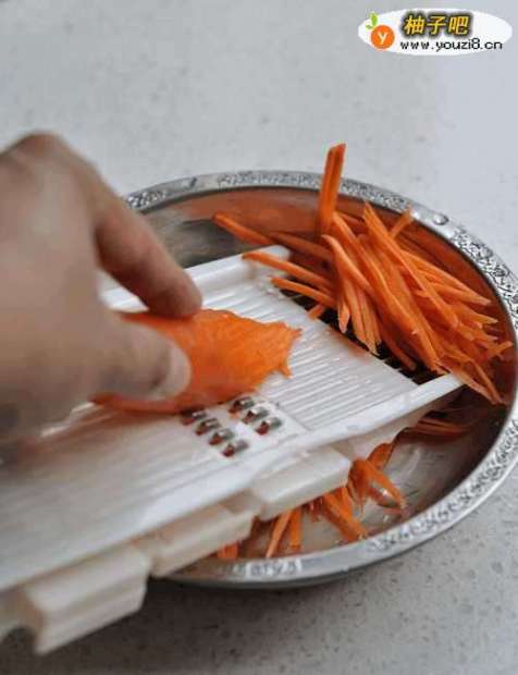 胡萝卜洗净用擦床(擦丝器)擦成丝。