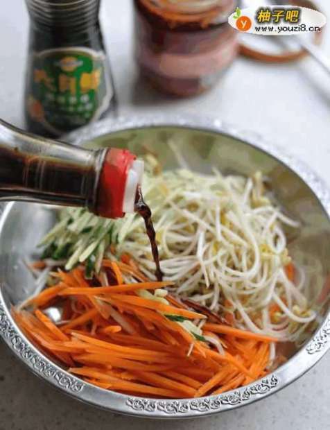 1.胡萝卜洗净用擦床(擦丝器)擦成丝。2.锅里倒入清水,水开后放入胡萝卜丝焯水后捞出。3.绿豆芽淘洗干净后入开水锅焯熟,捞出控水备用。4.黄瓜洗净切丝盛到干净小盆里,放进焯好的胡萝卜丝,绿豆芽,倒入凉拌酱油。5.调入凉拌醋。6.洒上少许的精盐,拌匀。7.最后调入适量的油泼辣椒,拌匀即可装盘。