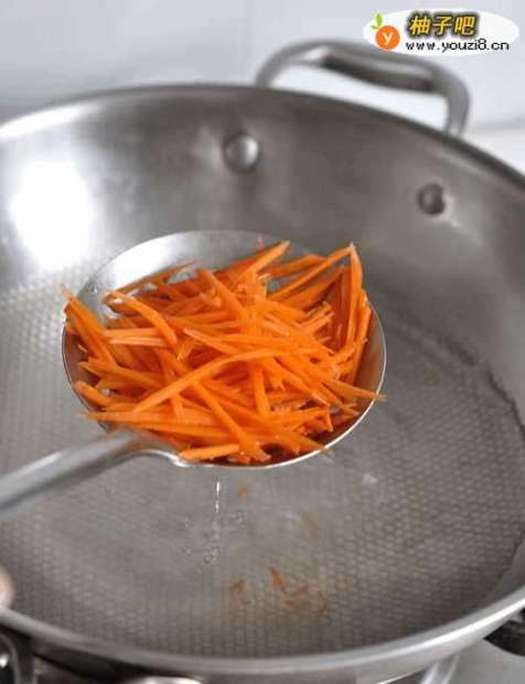 2锅里倒入清水,水开后放入胡萝卜丝焯水后捞出。
