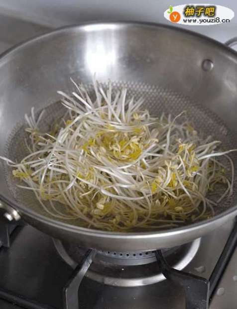 3绿豆芽淘洗干净后入开水锅焯熟,捞出控水备用。
