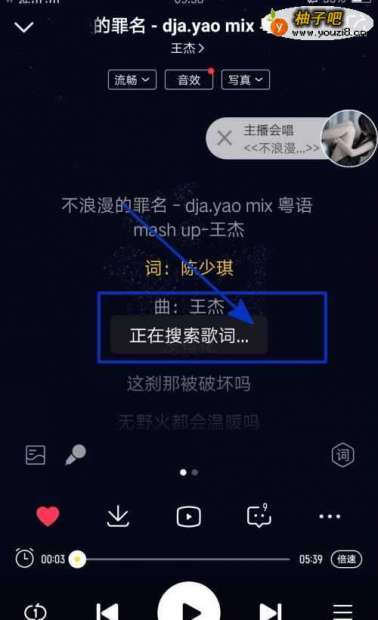 7这时能在播放页面中看到正在搜索歌词的警告字样;