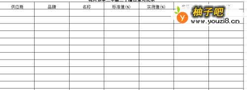 3在第二行里依次输入表头内容:供应商、品牌、名称、标准值(%)、实测值(%)、合格率(%)、备注。