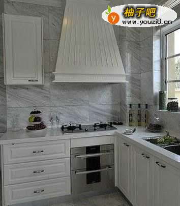 墙面和地面都采用同样材质的花灰色大理石进行铺装,沉稳大气,更有延伸视觉的效果。白色橱柜和特别装修设计的油烟机挡板和谐统一。