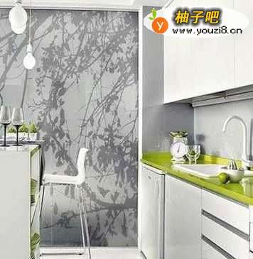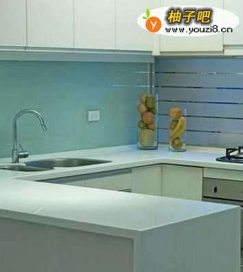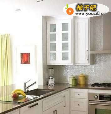 在小户型厨房里,多运用能反光的材料能让小空间更为明亮宽敞。在白色橱柜之外,搭配、亮、片、马赛、、克、瓷砖,并把橱柜的上柜也设计成玻璃窗,你会发现小户型厨房并不逊色。