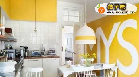 白色的下柜、黄色的上柜,白色的餐桌、多彩的餐椅,黄色的墙面、白色的字母装饰……这个小户型厨房的对于黄色与白色运用简直能作为典范,暖暖的,很舒适。