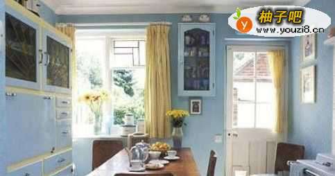 在选择了浅蓝色橱柜和餐厅柜之后,又将墙面也刷成一样的浅蓝色,整个厨房更为协调,窗户和玻璃门的设计同样让视觉延伸。
