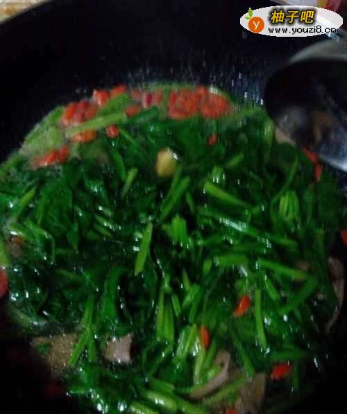 6水沸起来后,拿起锅盖,加入焯过的菠菜,然后搅匀,再煮1-2min左右,如下图: