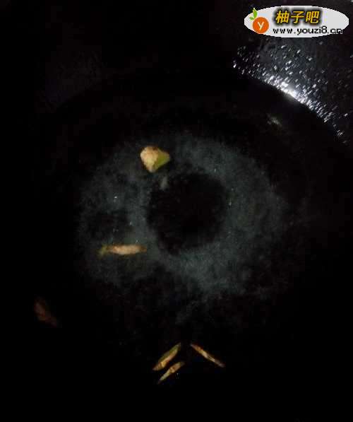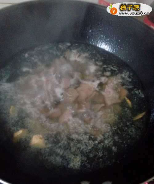 4原材料准备好了,开始烹饪。油锅一满,放入切好的姜片炒动一会,然后再加入腌制好的猪肝炒动,炒到猪肝由鲜红色变为肉白色后,加入适量的水,如下图: