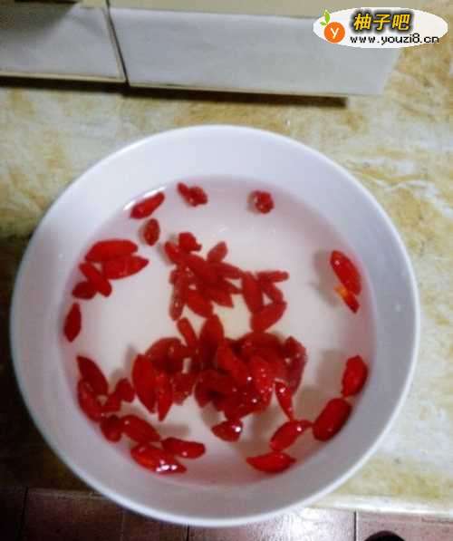 猪肝菠菜枸杞汤的原材料之一枸杞,抓一小把枸杞放入碗中,加入适量的水浸泡,约泡15min以上为宜,如下图: