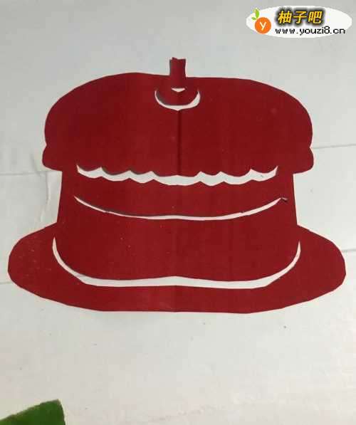 6第六步 剪完外围多余的彩纸之后 再剪里面细节部位 镂空的部分 还有其它涂实的部分 全部都剪完之后展开压平 一个漂亮的蛋糕就裁剪完成了