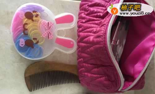 3一个化妆包,化妆包里有很多孩子上台前化妆的化妆品,皮筋,夹子,头饰,梳子等。