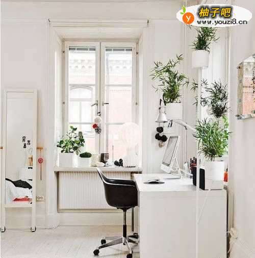 清爽风格:白色墙面、白色书桌,衬托整个房间的光线都非常光亮清爽,再立体布置几盆绿植,很有环保情调。