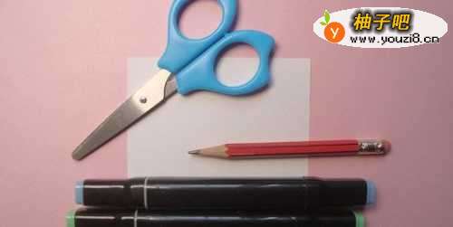 准备好,制作泳衣图形剪纸手工的材料和工具,有白纸、正方形卡纸、马克笔、铅笔,剪刀,如下图所示。