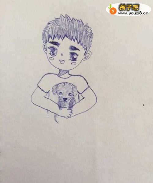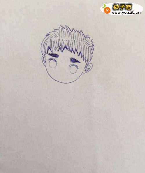 首先在纸上,用蓝色圆珠笔画出男生的头部轮廓。我们画出乔治的发型,用笔勾勒出发丝纹理。我们画出乔治的面部五官。