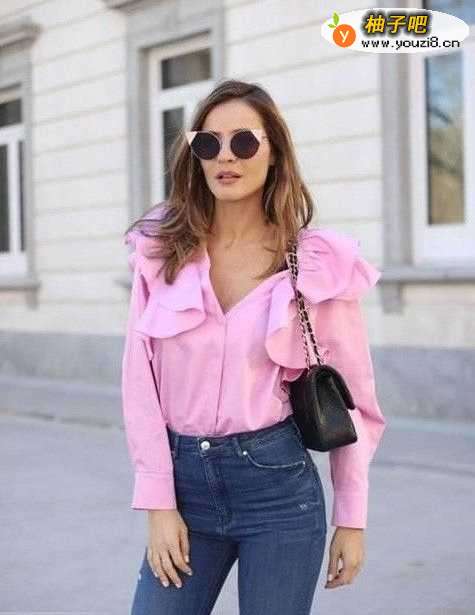 搭配一:牛仔裤论百搭,不得不提牛仔裤,当然是比较经典的款式,像蓝色九分牛仔裤、破洞牛仔裤、紧身牛仔裤等,搭配粉红色上衣很时尚。