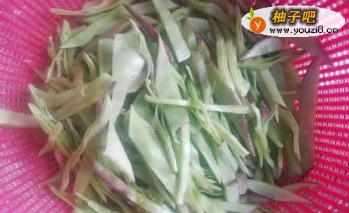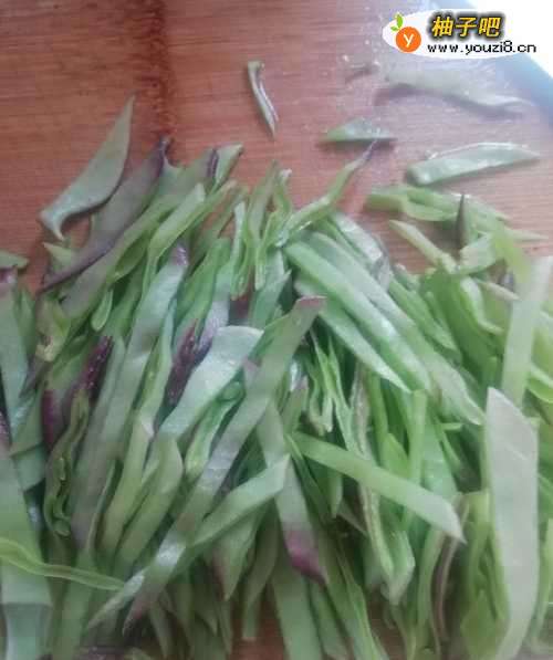 2这里的秋扁豆比较大,炒丝是最好的,需要一个个切丝,这里有点浮躁,刀工欠缺很多。