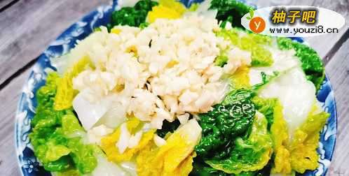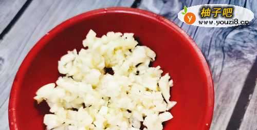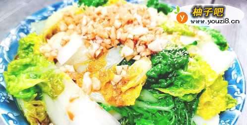 5把焯过水的黄心菜放在盘子里,再把蒜末放在上面。