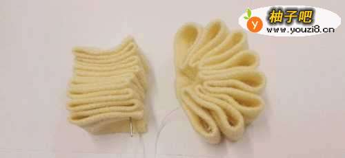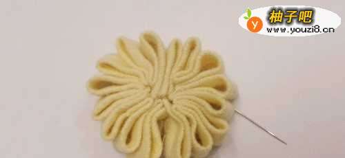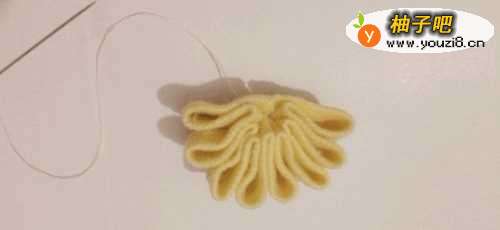 10把线抽紧,第二条布条又形成了半个花朵,把两边的半个花朵紧紧地缝在一起,就组成了一个花朵。