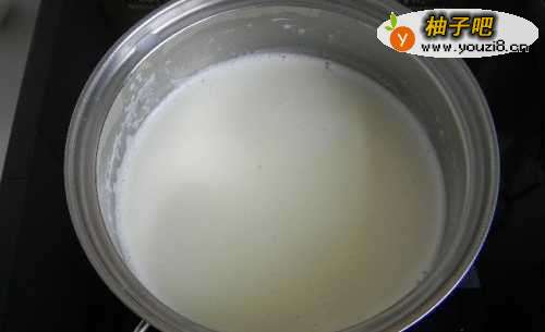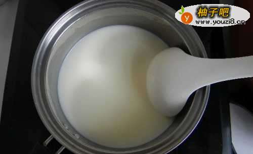 4鲜牛奶放入奶锅小火慢煮,同时不断搅动,防止牛奶表面起过多的大气泡。