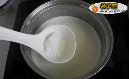5煮到温热,一分钟左右加入白糖,继续煮。