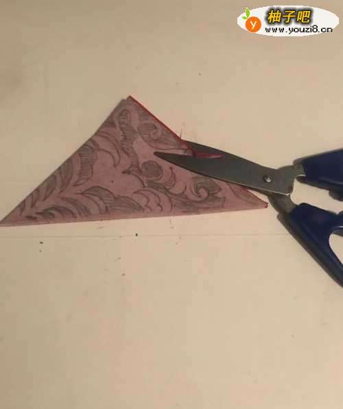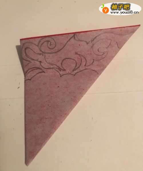 3第三步 折叠完三步之后 旋转一下 大头朝上 大约上三分之一向下折一下 然后再上面画上上半部分的图案