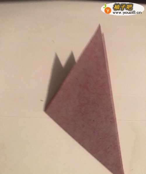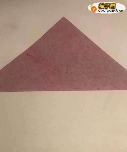 第一步 取一张长度和宽度都是16厘米的正方形红色彩纸 先把它从下向上对角折叠整齐